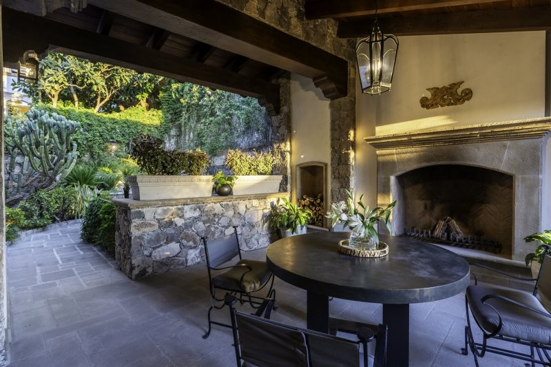 The stunning garden was designed by local landscape expert Timoteo Wachter, features mature foliage, Zen water elements, and stone pathways leading to a tranquil gazebo. Toward the back of the property, you will find a refreshing plunge pool with a cascading waterfall and various outdoor seating areas.