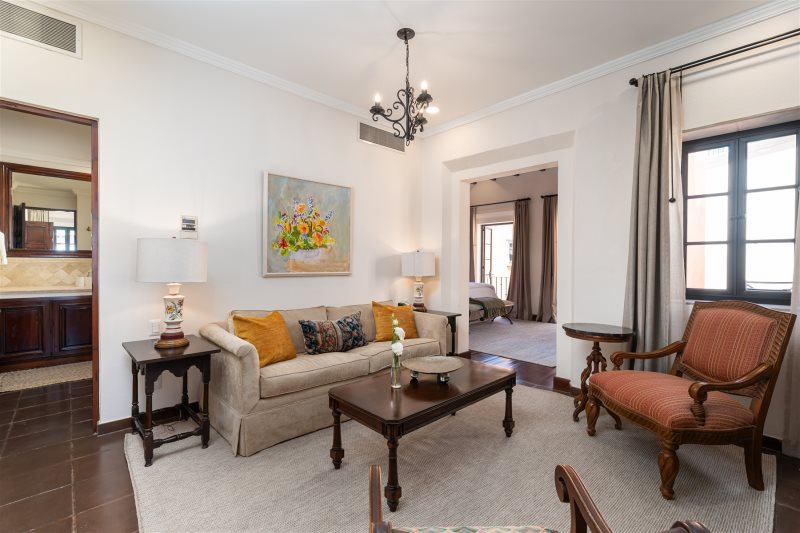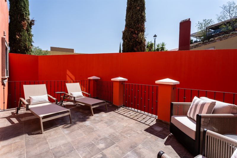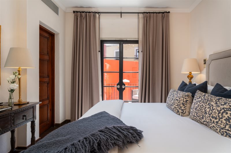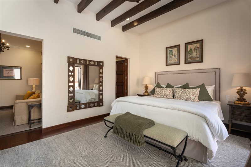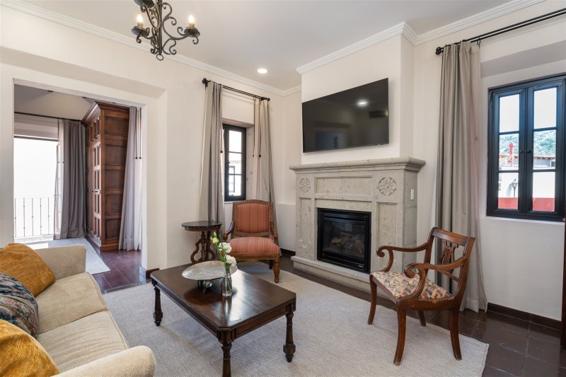 Distinguished by its private sitting room with carved cantera fireplace and a wrought-iron balcony overlooking San Miguel's vivid streetscape. Exposed wood beam ceilings and sage green linens bring the color of the surrounding hills indoors, while gilded baroque lamps cast a warm, painterly glow.
