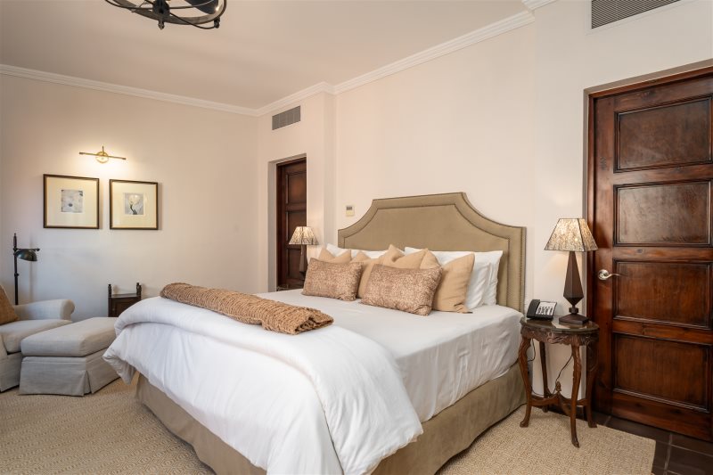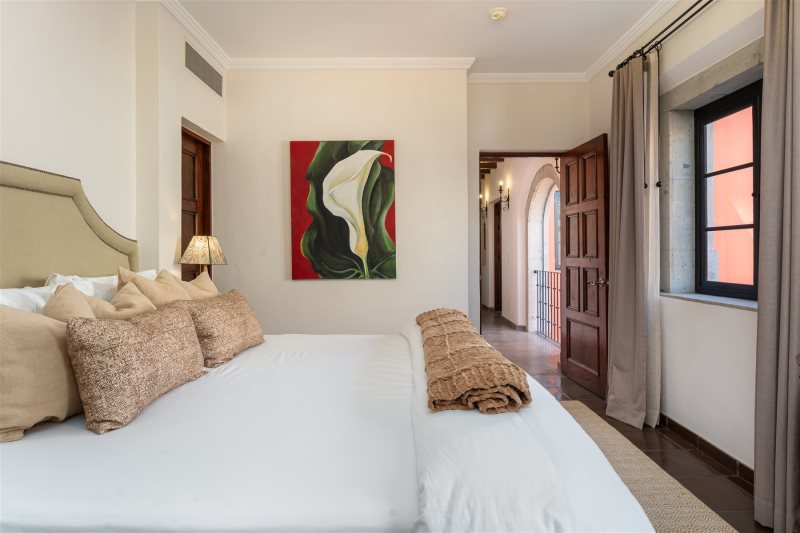 Draped in sand and beige textiles that glow softly in the morning light. A bold calla lily painting on a crimson ground anchors the room with Mexican artistic spirit, while hand-carved antique furnishings encourage relaxation.