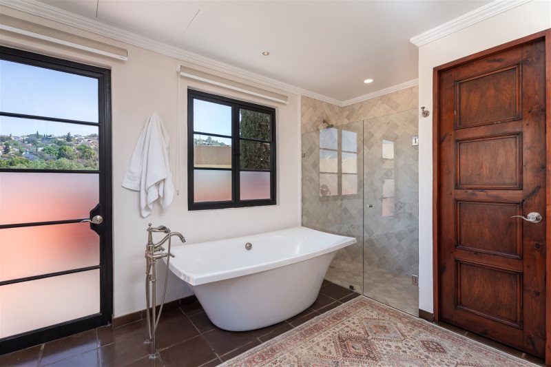 A spacious, light-filled retreat crowning the third floor — its own fireplace flanked by curved lounge chairs, a freestanding soaking tub with a separate shower, and a double-sink travertine vanity. Terracotta bench, rust velvet pillows, and gilded sconces bring warmth to every corner.