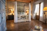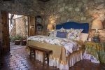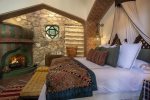 The "master suite" has a king size bed, three patios, three fireplaces, and a large bathroom/dressing area.